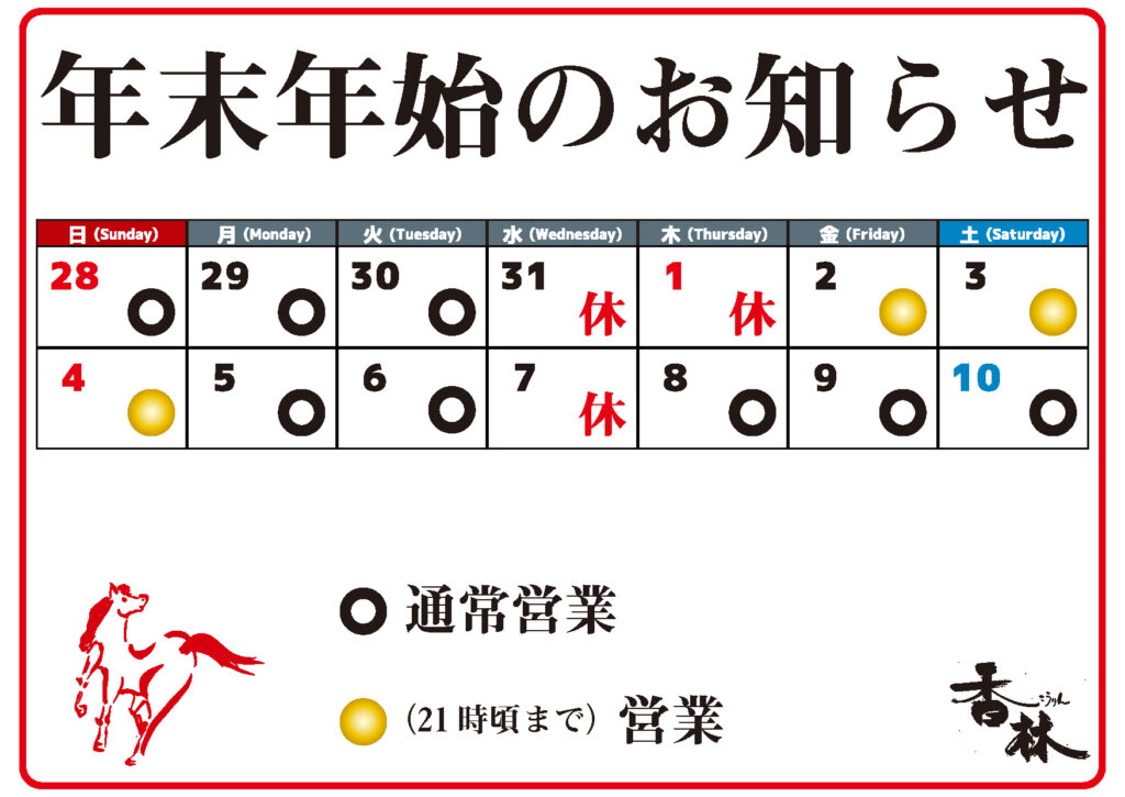 1月2日(金)~4日(日)21頃までの営業
